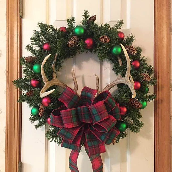 Did a little crafting with my husband today. Mike and I made this wreath together ~ it was totally his idea! The antlers are from a deer he got last year in Texas. We added a few colored bulbs, pinecones and a plaid wreath to finish it. I think this may be my favorite wreath, ever!!#twelvedollarsandatriptotexas